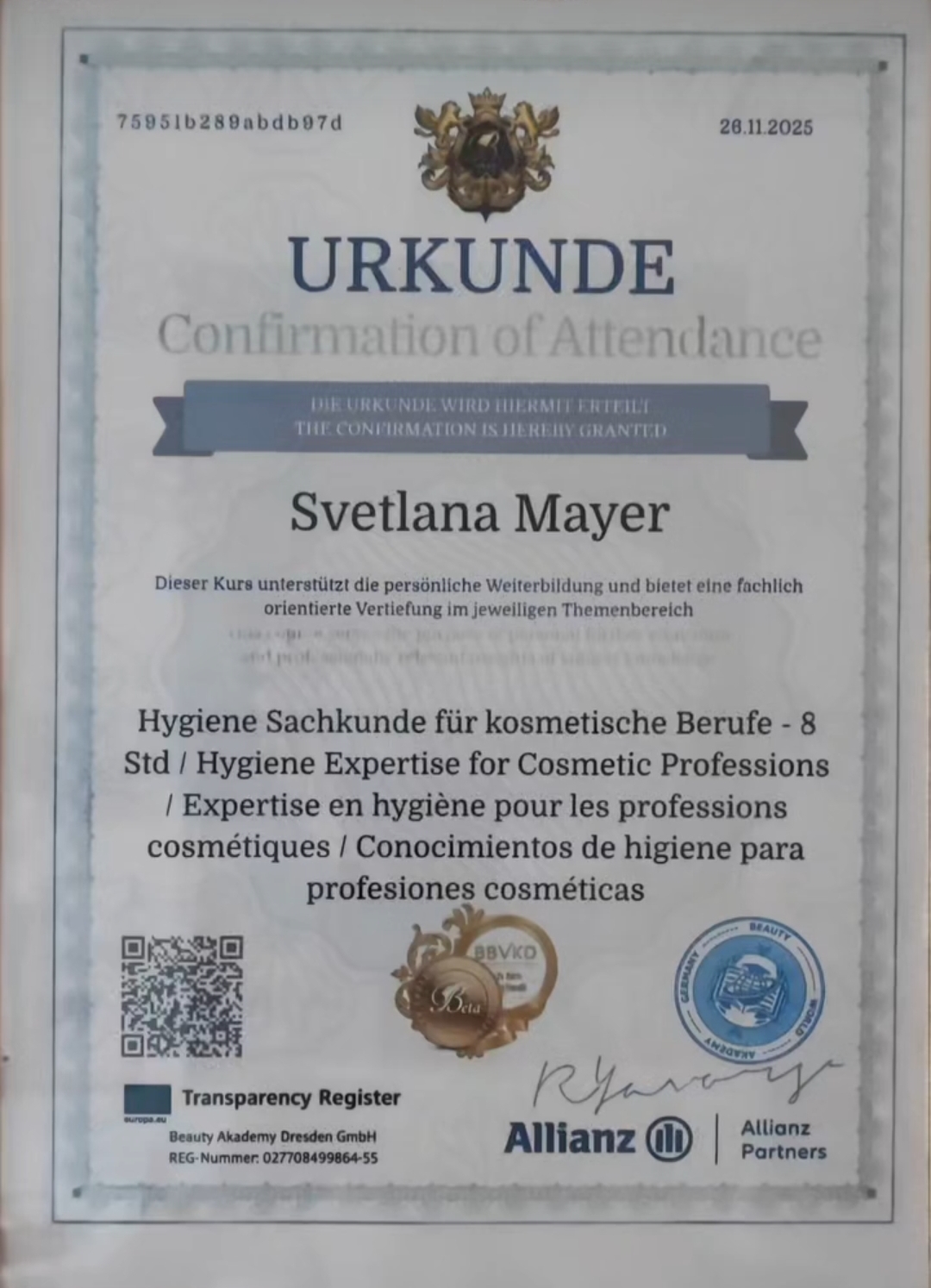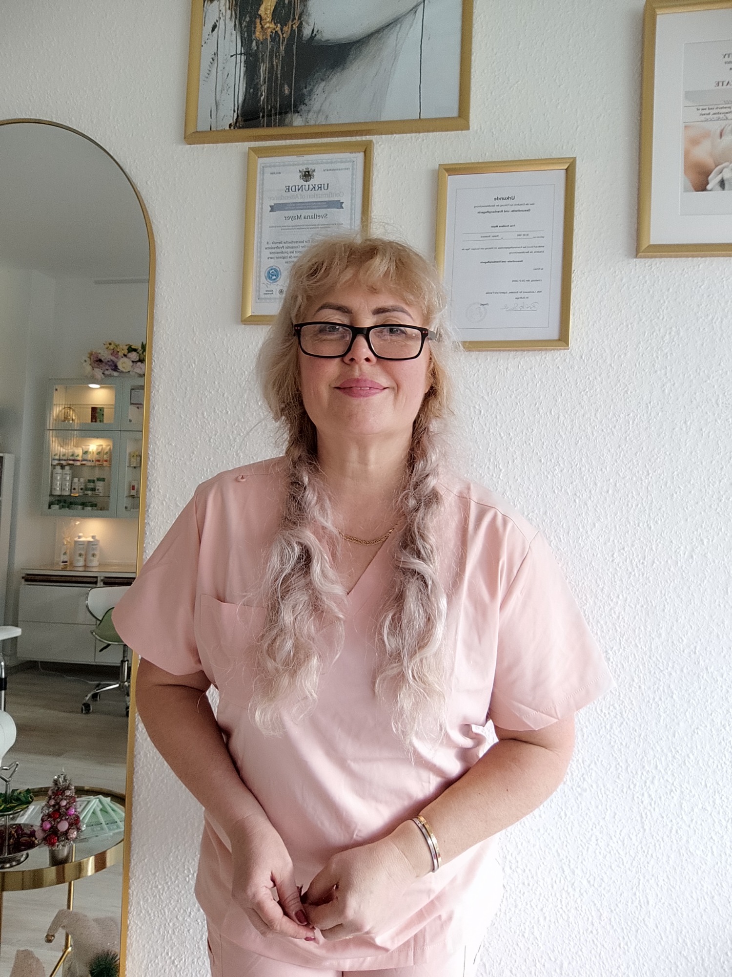 Svetlana Mayer ist diplomierte Krankenschwester und geprüfte Beauty-Expertin mit Spezialisierung auf Maniküre, Naturnagelverstärkung, Gelmodellagen, Babyboomer, French, Pediküre sowie